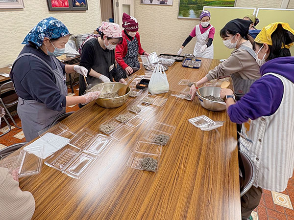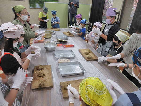 料理部による郷土料理作りも同時に行われ、「ごまぶかし」「きりせんしょ」を作りました。児童は菅野さち恵さんを講師にネイチャーゲームも体験。自然の物(枯れ葉や木など)を使った遊びやロケットストーブを使っての火起こし体験、じゃがいも、さつまいもを蒸かしての試食もあったりと自然と触れ合いながら秋を満喫。
