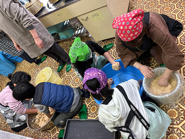 途中の作業を挟んで、2日目には見事米麹の完成!!大豆をミンチにする作業では子供達の活躍もあり、素早く終える事ができました。